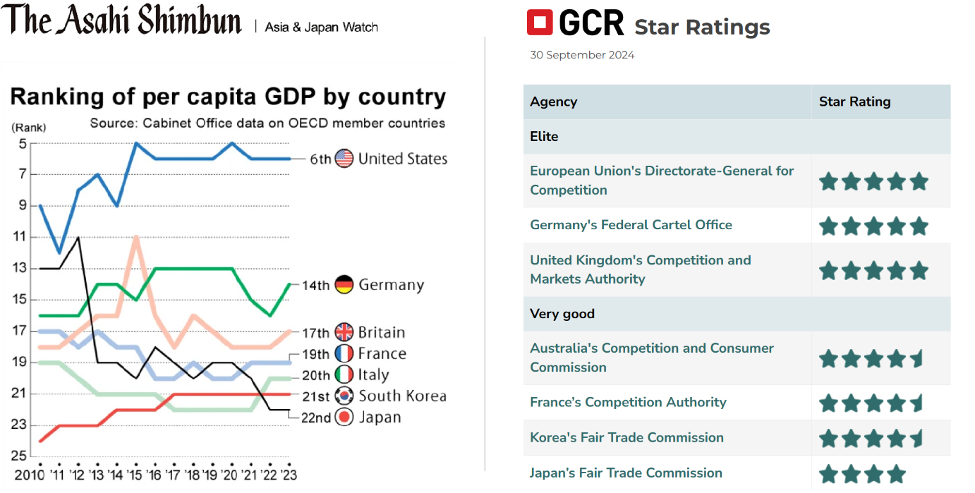 Sources: Hisashi Naito, ‘Japan’s per capita GDP ranks 22nd in OECD, behind South Korea’ The Asahi Shimbun (December 24, 2024); Global Competition Review, Rating Enforcement: Star Ratings 2024 (September 2024).