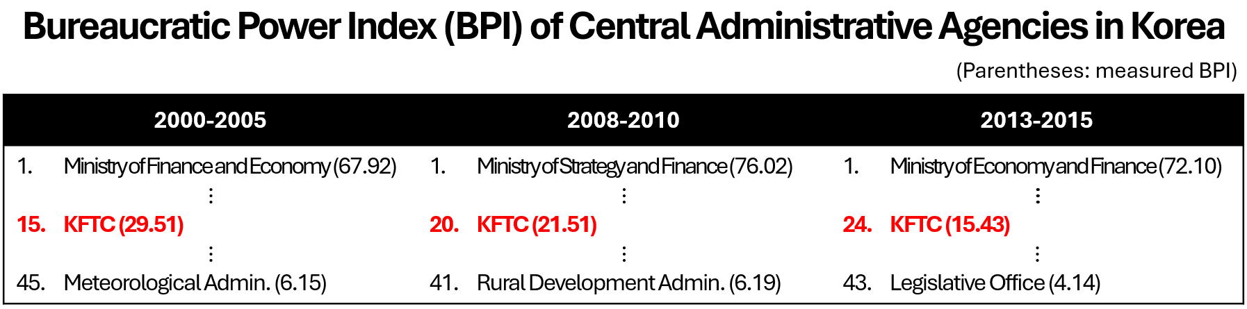I have not found empirical studies that quantify bureaucratic power rankings within the Japanese government, in contrast to Kenneth J. Meier’s empirical analyses of power hierarchies among US federal agencies (1980) and Jae-Rok Oh’s studies of the Korean bureaucracy, which show that the KFTC occupies a mid-level position within the Korean government (2006; 2011; and 2018). Therefore, it is difficult to assert that the JFTC’s possibly limited internal power has directly shaped its passivity.